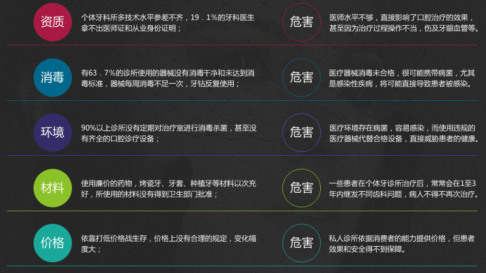 • 绝大部分患者是因为贪图小便宜,没有慎重考虑而随便到小诊所甚至游医制作烤瓷牙,劣质材料制成的烤瓷牙含有对人体有害的金属元素较多,因此为牙齿埋下了祸根,导致牙龈炎、牙龈变色、咬颌痛及基牙松动等等,时间长了甚至能引发牙龈癌....【我要咨询】