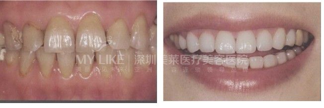 三、 美莱隐形牙贴面、美莱生态烤瓷牙修复牙齿,可将严重的口腔牙列不齐、牙缝大、四环素牙、氟斑牙、畸形牙、变色牙及各种牙齿缺损、牙齿缺失和烤瓷失败边缘发青等进行修复,让有牙病患者能够如愿以偿,恢复整齐洁白牙齿。