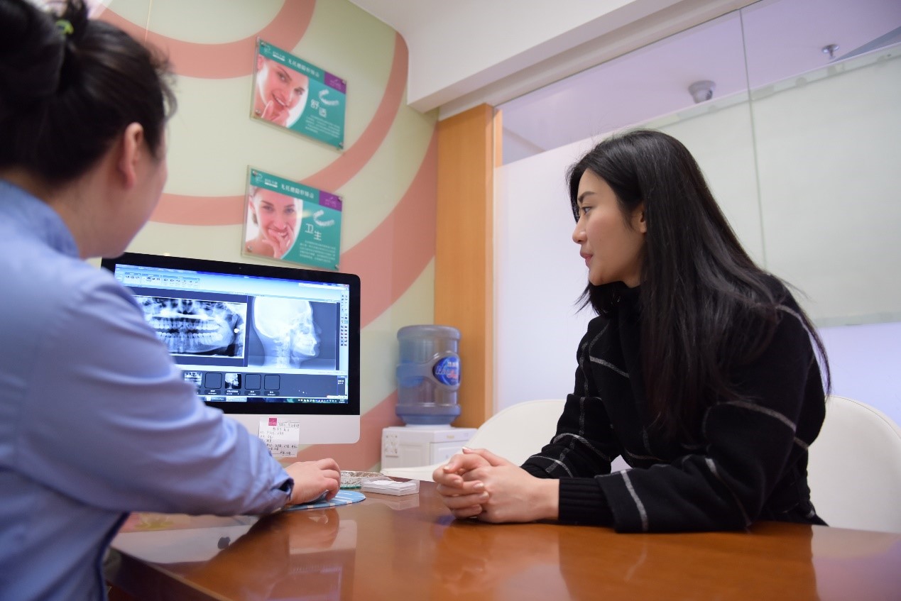 韩旭院长是隐适美中国认证医师。韩旭院长通过电脑,向晓霞模拟演示牙齿的矫